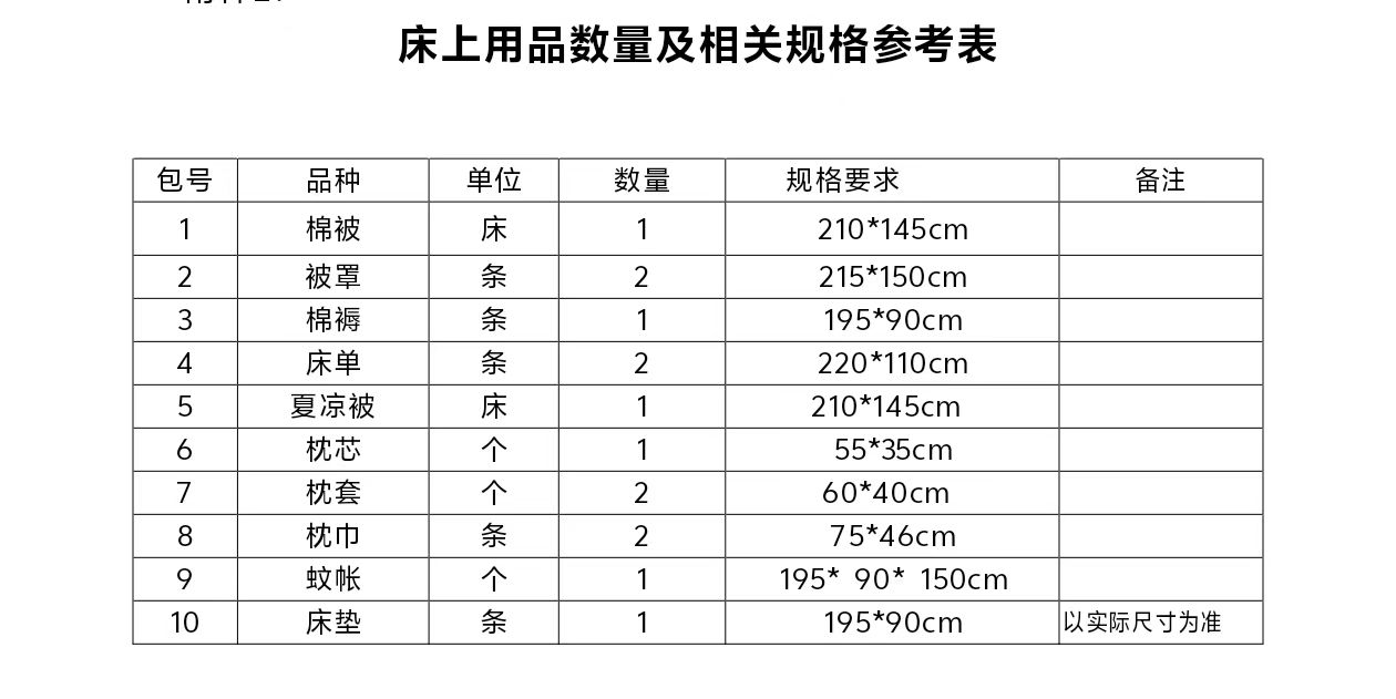 自带床上用品的新生,请参照卧具标准清单选择用品的颜色及相关尺寸。为确保广大学生的身体健康,请勿将影响学生健康的用品(如黑心棉、含有虫螨等的用品)带入公寓。