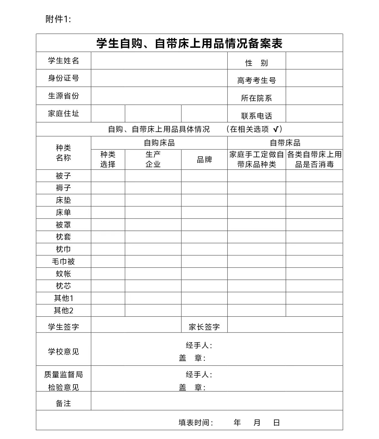 附件:学生自购、自带床上用品情况备案表、床上用品数量及相关规格参考表