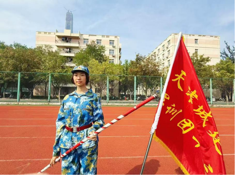 红旗在训练场畔猎猎招展,她身着迷彩挺立其侧,双手紧握军棍,棍身与制服的褶皱在风里绷出笔直的线条。“天津城建大学军训团十三营” 的旗帜恰在斜后方扬起,猩红底色衬得她的站姿愈发端正,帽檐下的目光如淬了光的钢,将 “责任” 二字凝在挺拔的肩线里。